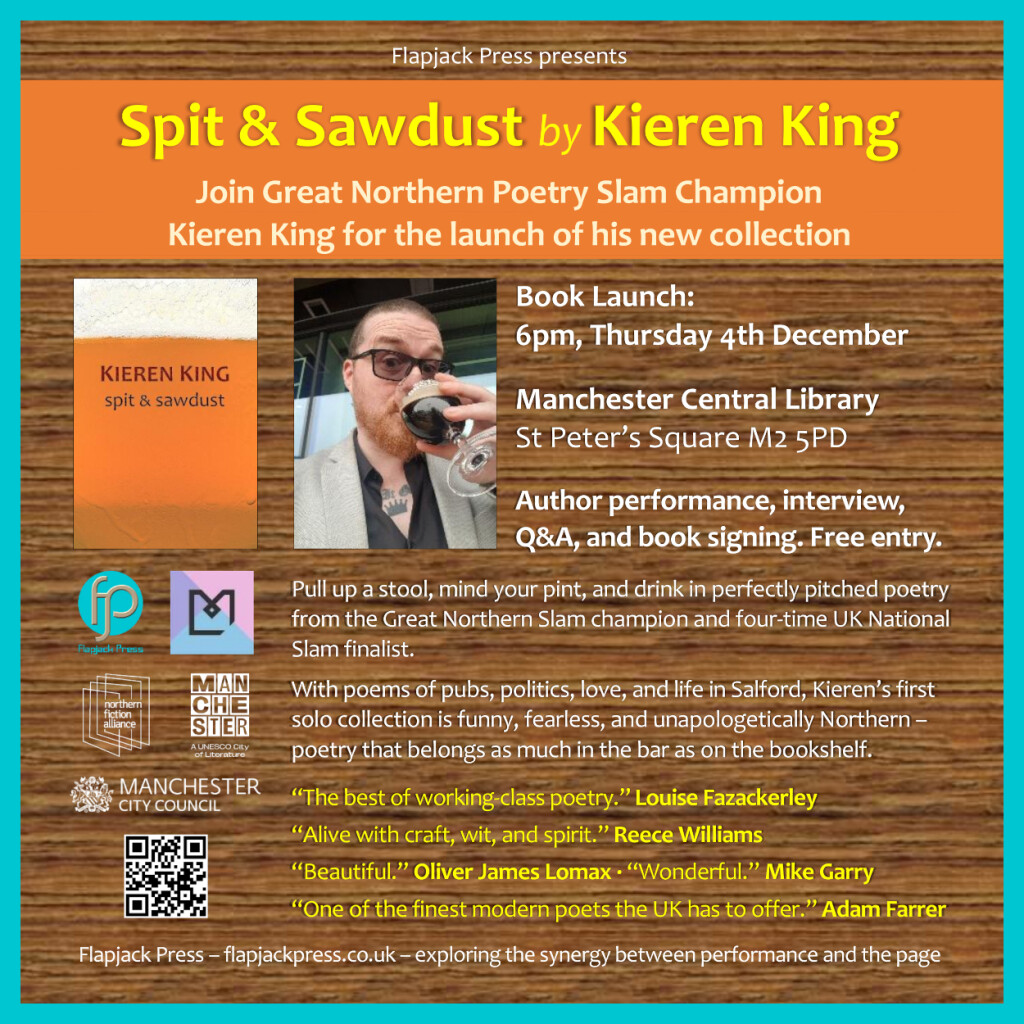 Kieren King is a Salfordian spoken word artist, a four-time UK National Slam finalist, and a Great Northern Poetry Slam champion. He was a host of Bang Said the Gun: Manchester, and the creative mind behind the acclaimed spoken word nights Slamchester, Evidently, and the Word War slams. He has featured on BBC Radio 4, performed for Musicians Without Borders and Amnesty International, and at the Kendal Calling, Edinburgh Fringe, and Glastonbury festivals. Kieren has also been a special guest at former NME journalist and Haçienda DJ Dave Haslam’s Not Quite Light Weekender, and been commissioned by Guy Garvey of Elbow to curate a spoken word event for Meltdown at the Southbank Centre, by Sky to write and perform a poem to launch their channel Blaze, and by Salford Red Devils Rugby League FC to celebrate their appearance in the Super League Grand Final.